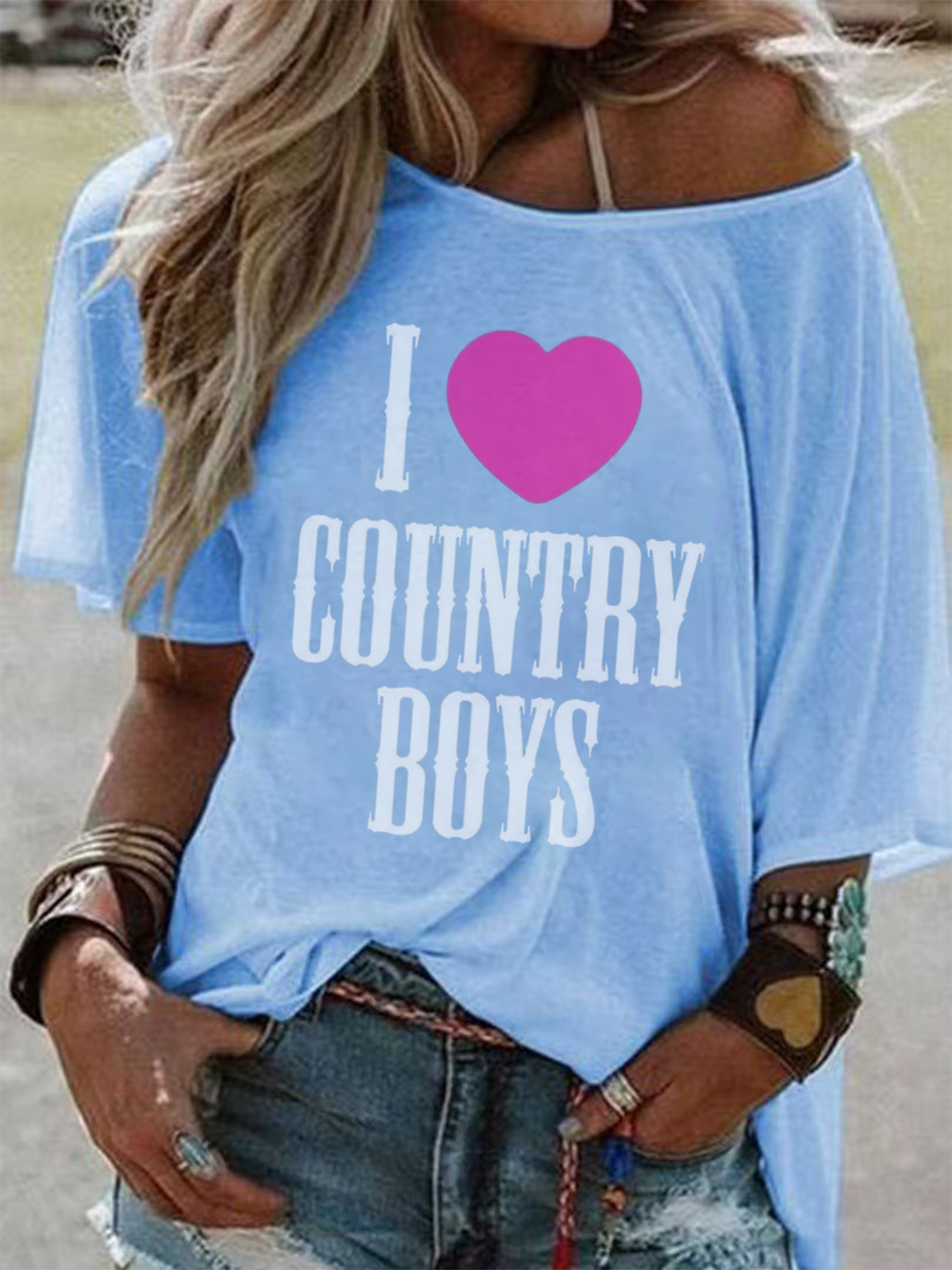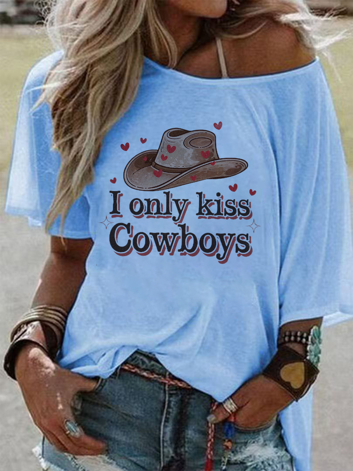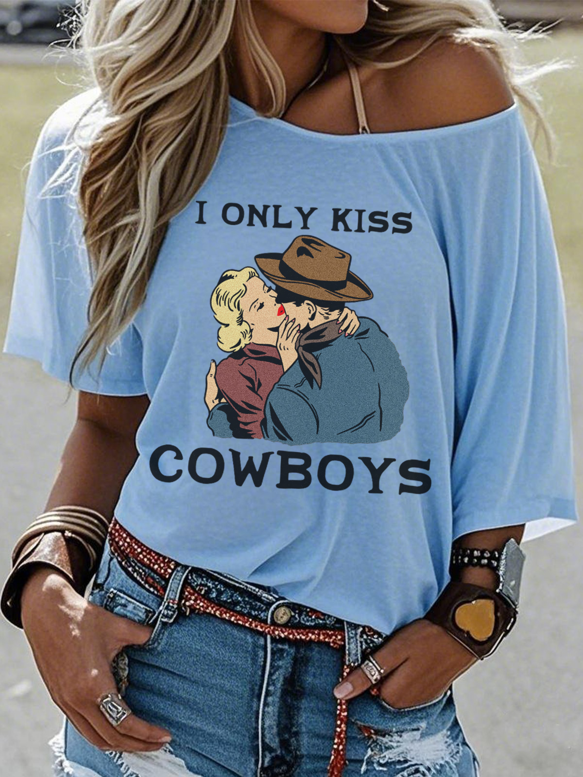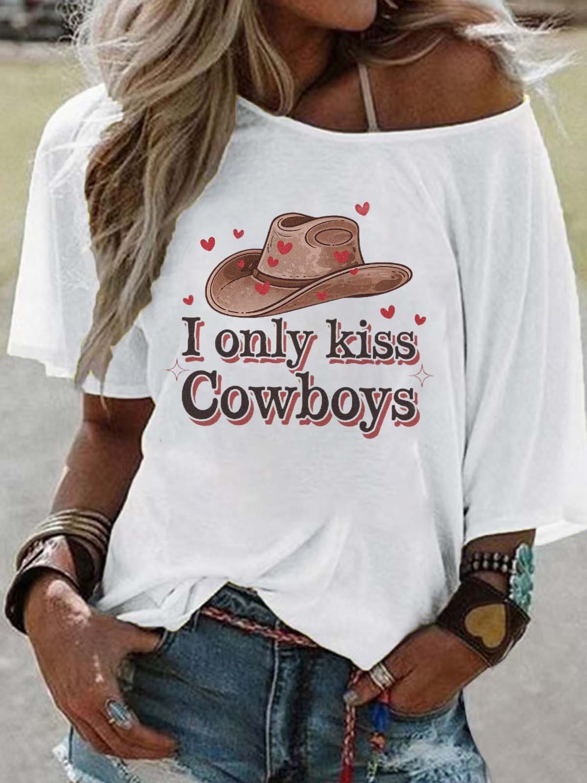 "I Only Kiss Cowboys" T-shirt Off-the-Shoulder Cowboy Hat Graphic Tees
