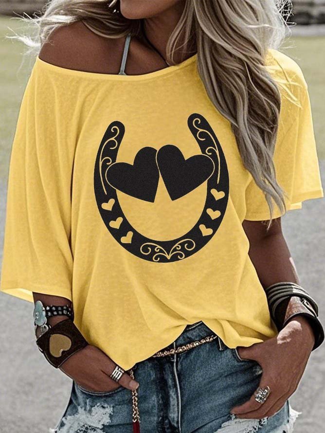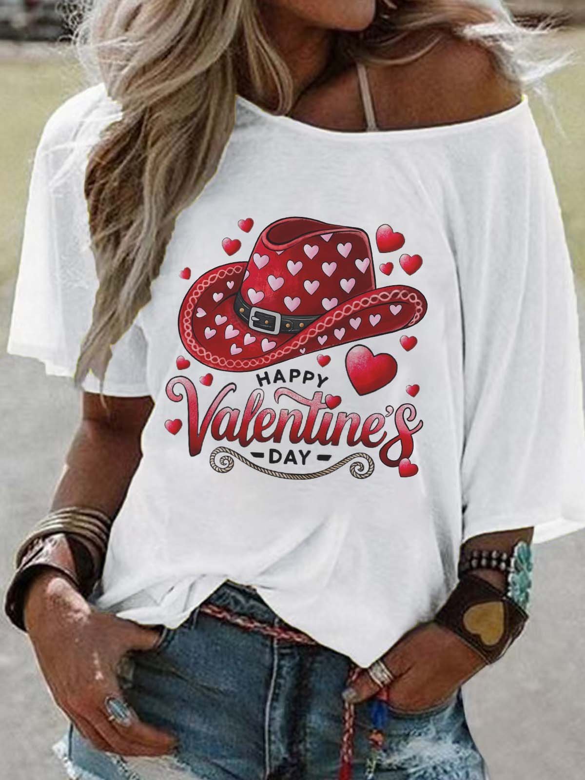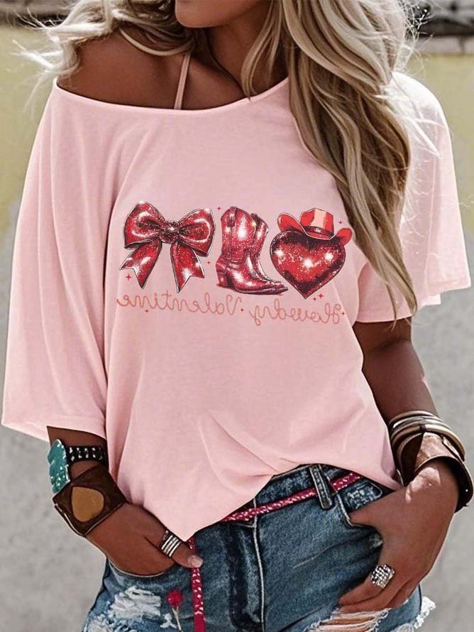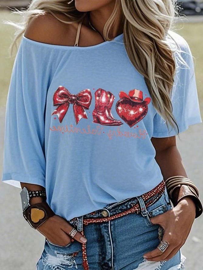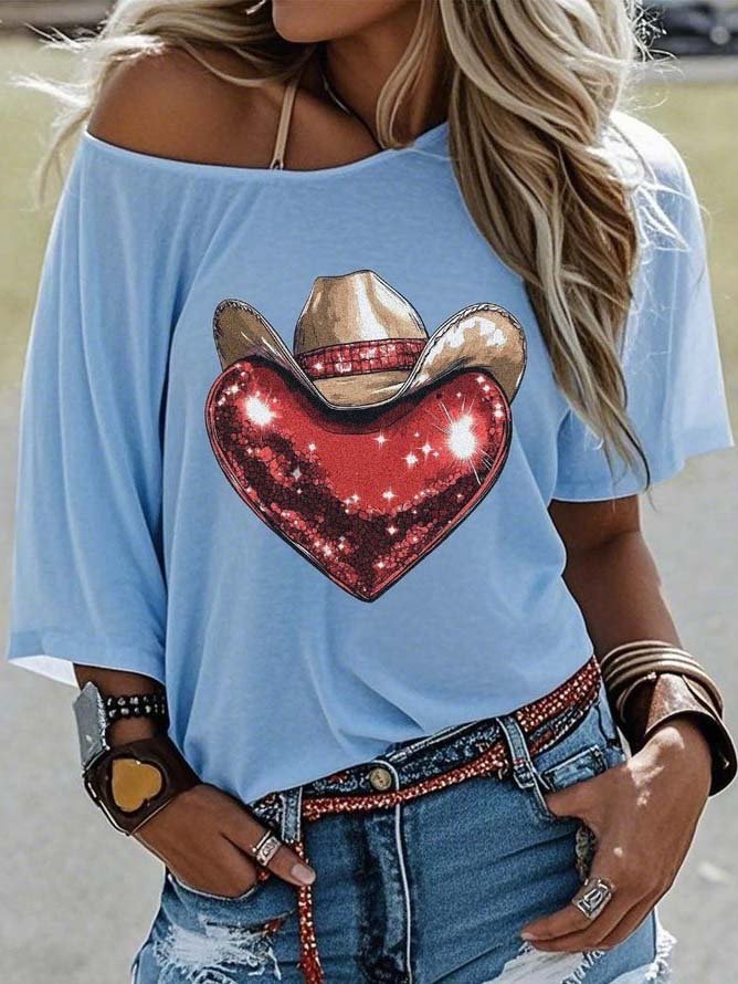 Off-the-Shoulder Short-Sleeve T-Shirt Valentine's Day Gift Cowboy Hat Printed Graphic Tees