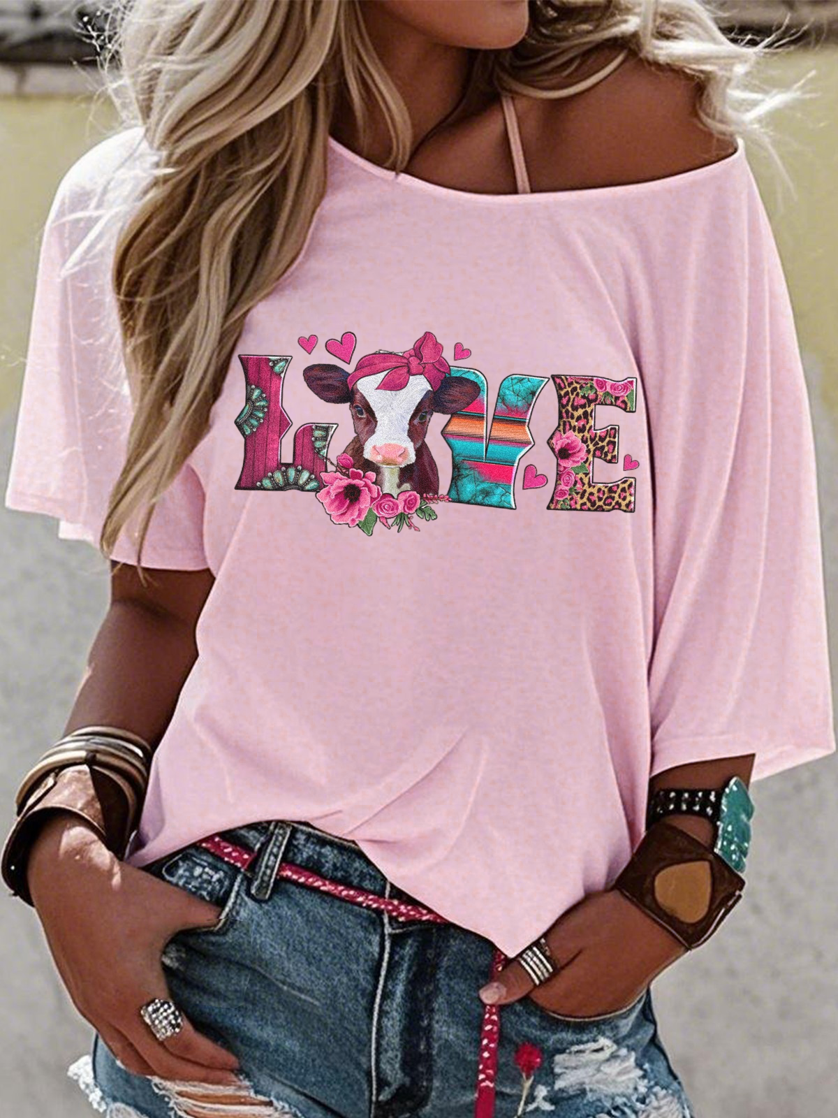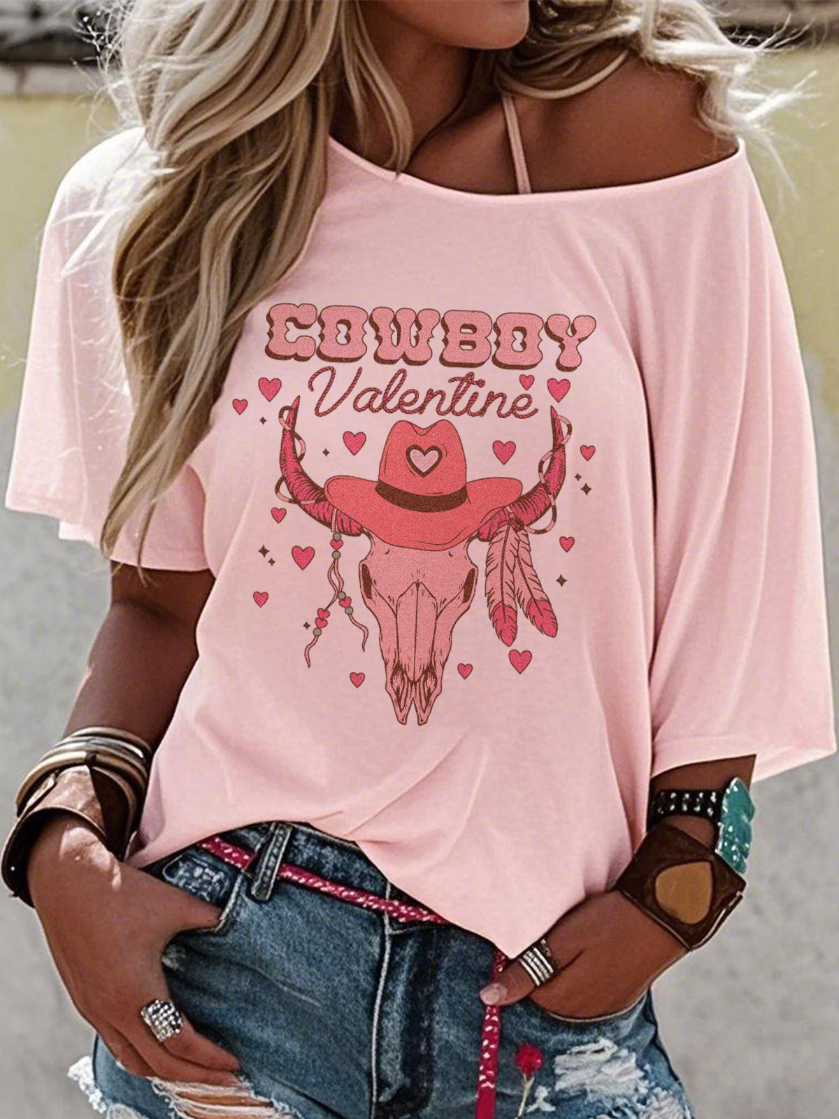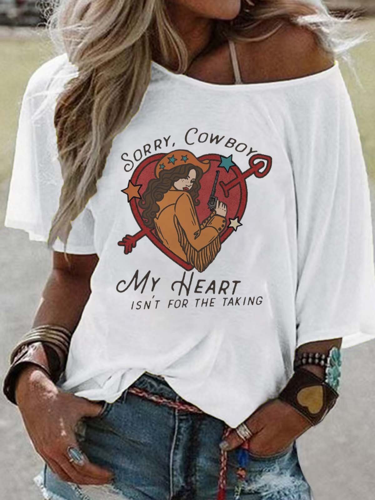 Off-the-Shoulder Short-Sleeve T-Shirt Valentine's Day Gift Cowboy Hat Printed Graphic Tees
